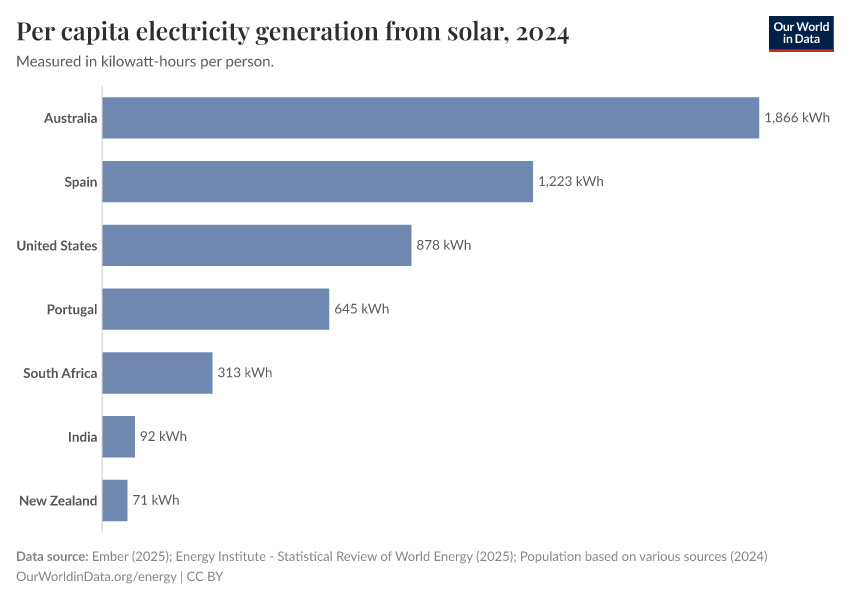 “Data Page: Electricity generation from solar power per person”, part of the following publication: Hannah Ritchie, Pablo Rosado, and Max Roser (2023) - “Energy”. Data adapted from Ember, Energy Institute, Various sources. Retrieved from https://archive.ourworldindata.org/20250925-233948/grapher/solar-electricity-per-capita.html [online resource] (archived on September 25, 2025).How to cite this data