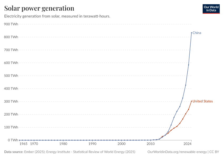 Ember (2025); Energy Institute - Statistical Review of World Energy (2025) – with major processing by Our World in Data. “Electricity generation from solar power” [dataset]. Ember, “Yearly Electricity Data Europe”; Ember, “Yearly Electricity Data”; Energy Institute, “Statistical Review of World Energy” [original data]. Retrieved December 18, 2025 from https://archive.ourworldindata.org/20250909-093708/grapher/solar-energy-consumption.html (archived on September 9, 2025).