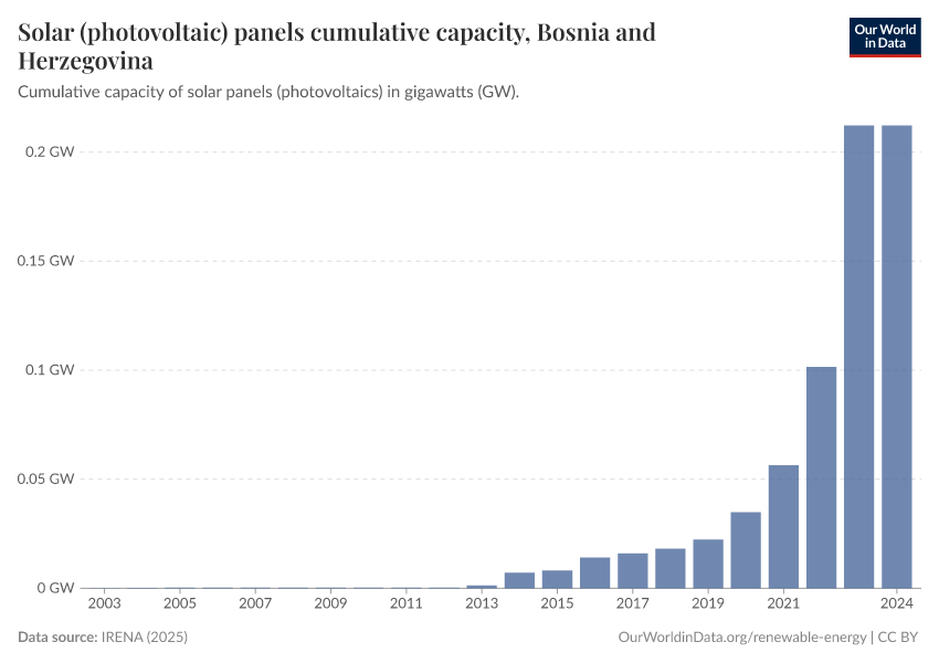 “Data Page: Solar photovoltaic capacity”, part of the following publication: Hannah Ritchie, Pablo Rosado, and Max Roser (2023) - “Energy”. Data adapted from IRENA. Retrieved from https://archive.ourworldindata.org/20250909-093708/grapher/solar-pv-cumulative-capacity.html [online resource] (archived on September 9, 2025).