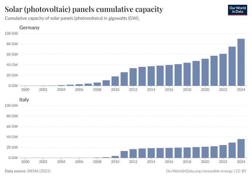 “Data Page: Solar photovoltaic capacity”, part of the following publication: Hannah Ritchie, Pablo Rosado, and Max Roser (2023) - “Energy”. Data adapted from IRENA. Retrieved from https://archive.ourworldindata.org/20250909-093708/grapher/solar-pv-cumulative-capacity.html [online resource] (archived on September 9, 2025).How to cite this data