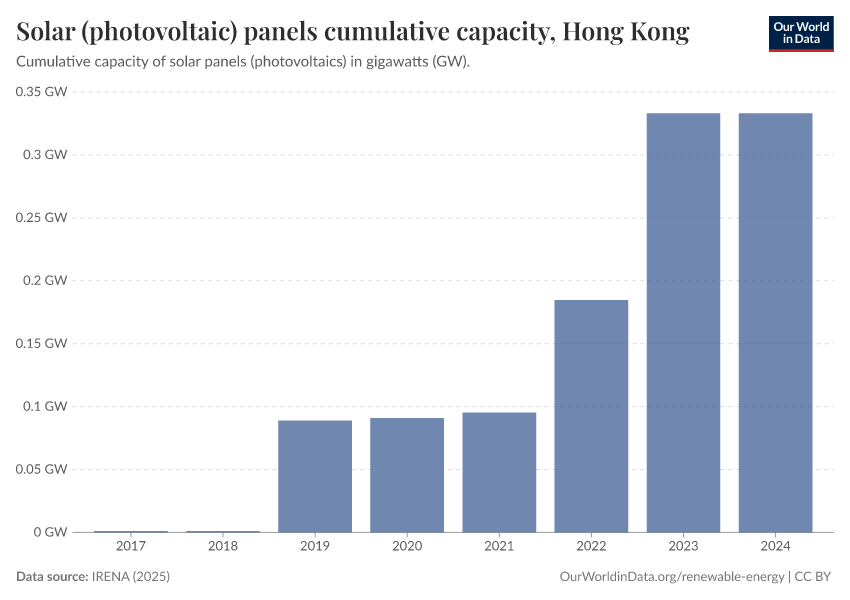 “Data Page: Solar photovoltaic capacity”, part of the following publication: Hannah Ritchie, Pablo Rosado, and Max Roser (2023) - “Energy”. Data adapted from IRENA. Retrieved from https://archive.ourworldindata.org/20250909-093708/grapher/solar-pv-cumulative-capacity.html [online resource] (archived on September 9, 2025).How to cite this data