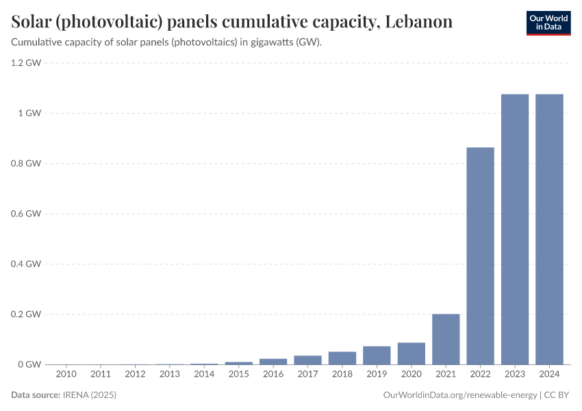 “Data Page: Solar photovoltaic capacity”, part of the following publication: Hannah Ritchie, Pablo Rosado, and Max Roser (2023) - “Energy”. Data adapted from IRENA. Retrieved from https://archive.ourworldindata.org/20250909-093708/grapher/solar-pv-cumulative-capacity.html [online resource] (archived on September 9, 2025).How to cite this data