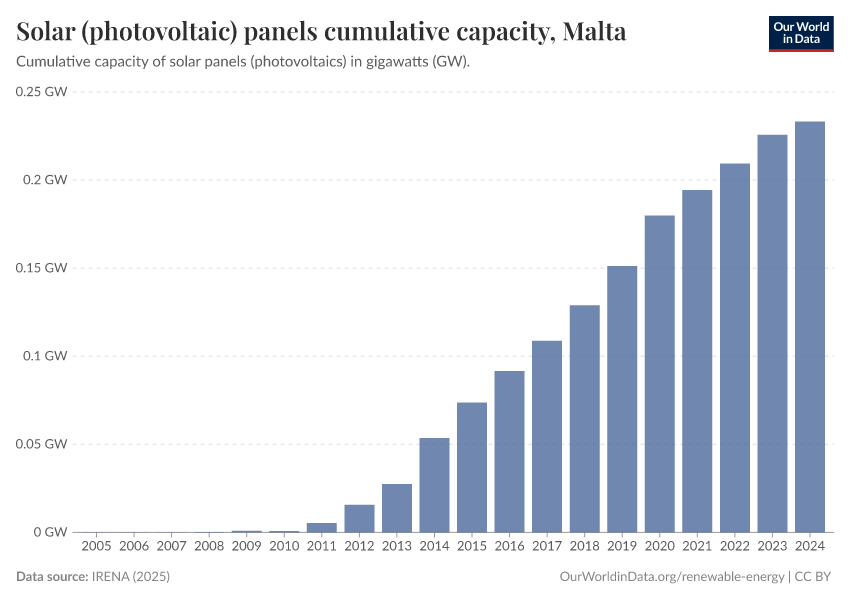“Data Page: Solar photovoltaic capacity”, part of the following publication: Hannah Ritchie, Pablo Rosado, and Max Roser (2023) - “Energy”. Data adapted from IRENA. Retrieved from https://archive.ourworldindata.org/20250909-093708/grapher/solar-pv-cumulative-capacity.html [online resource] (archived on September 9, 2025).How to cite this data