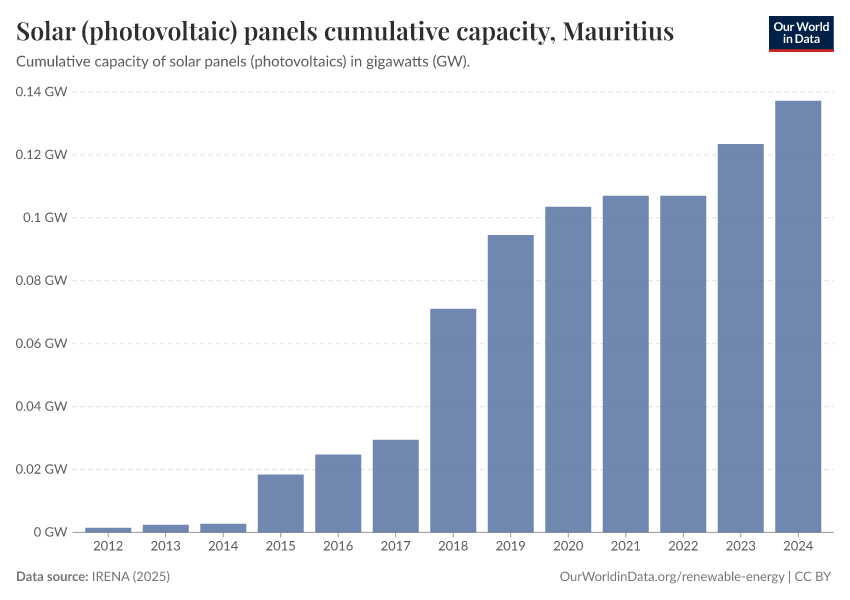 “Data Page: Solar photovoltaic capacity”, part of the following publication: Hannah Ritchie, Pablo Rosado, and Max Roser (2023) - “Energy”. Data adapted from IRENA. Retrieved from https://archive.ourworldindata.org/20250909-093708/grapher/solar-pv-cumulative-capacity.html [online resource] (archived on September 9, 2025).How to cite this data
