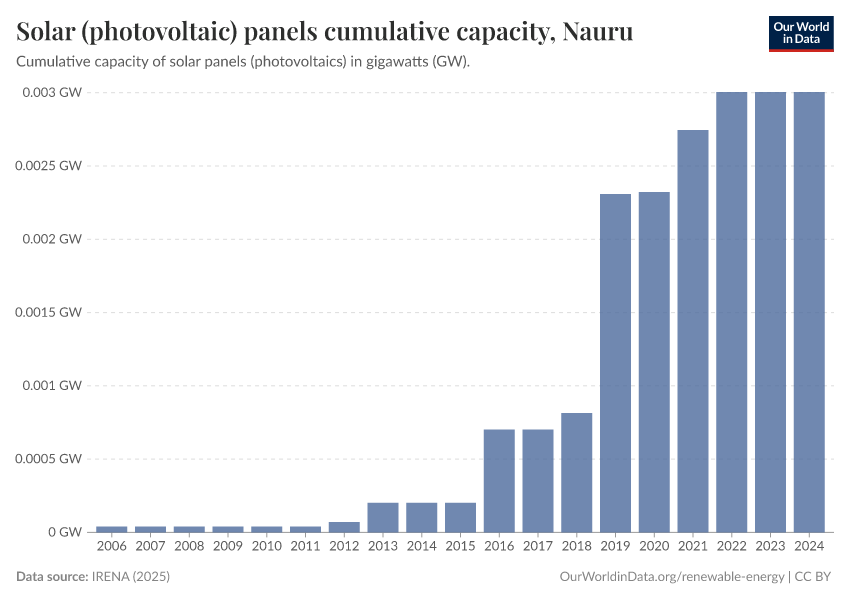 “Data Page: Solar photovoltaic capacity”, part of the following publication: Hannah Ritchie, Pablo Rosado, and Max Roser (2023) - “Energy”. Data adapted from IRENA. Retrieved from https://archive.ourworldindata.org/20250909-093708/grapher/solar-pv-cumulative-capacity.html [online resource] (archived on September 9, 2025).