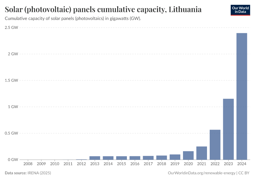 IRENA (2025) – processed by Our World in Data. “Solar photovoltaic capacity” [dataset]. IRENA, “Renewable Energy Statistics” [original data]. Retrieved November 12, 2025 from https://archive.ourworldindata.org/20250909-093708/grapher/solar-pv-cumulative-capacity.html (archived on September 9, 2025).