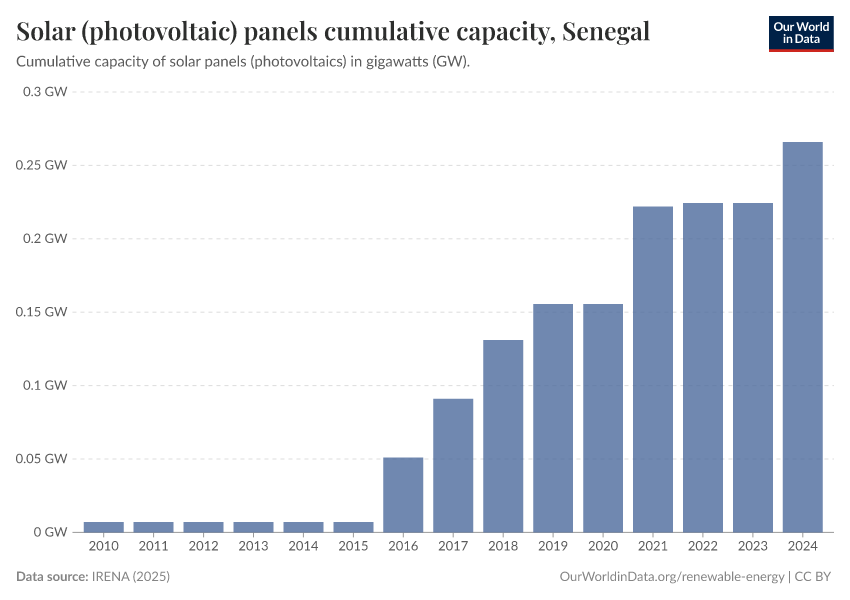 “Data Page: Solar photovoltaic capacity”, part of the following publication: Hannah Ritchie, Pablo Rosado, and Max Roser (2023) - “Energy”. Data adapted from IRENA. Retrieved from https://archive.ourworldindata.org/20250909-093708/grapher/solar-pv-cumulative-capacity.html [online resource] (archived on September 9, 2025).How to cite this data