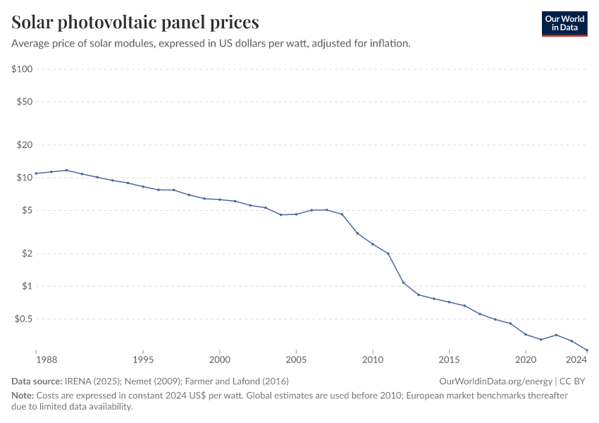IRENA (2025); Nemet (2009); Farmer and Lafond (2016) – with major processing by Our World in Data. “Solar photovoltaic module price” [dataset]. IRENA, “Renewable Power Generation Costs in 2024”; Nemet, “Interim monitoring of cost dynamics for publicly supported energy technologies”; Farmer and Lafond, “How predictable is technological progress?” [original data]. Retrieved March 20, 2026 from https://archive.ourworldindata.org/20260304-094028/grapher/solar-pv-prices.html (archived on March 4, 2026).
