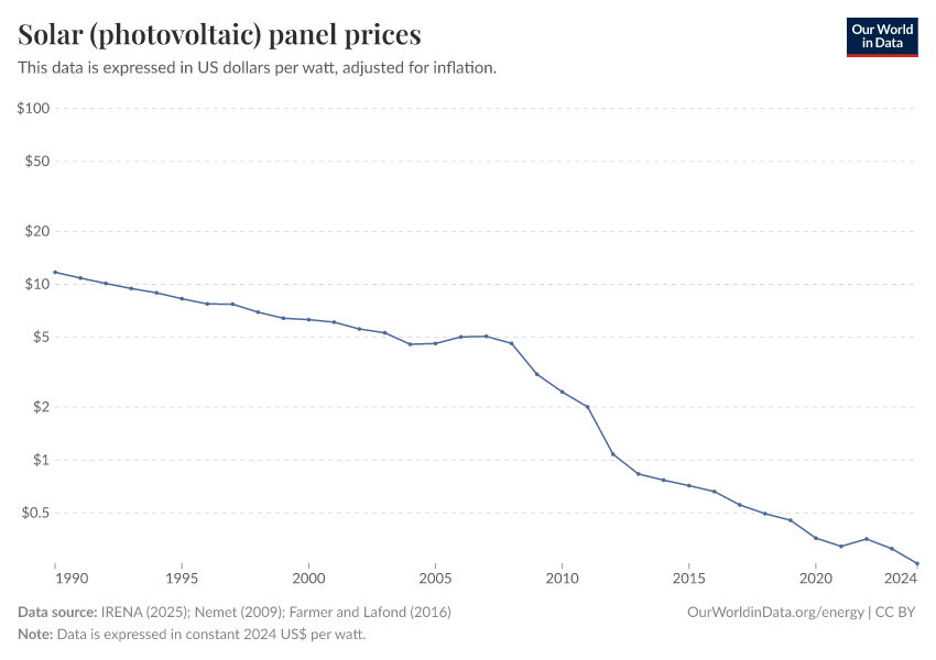 “Data Page: Solar photovoltaic module price”, part of the following publication: Hannah Ritchie, Pablo Rosado, and Max Roser (2023) - “Energy”. Data adapted from IRENA, Nemet, Farmer and Lafond. Retrieved from https://archive.ourworldindata.org/20250909-093708/grapher/solar-pv-prices.html [online resource] (archived on September 9, 2025).How to cite this data