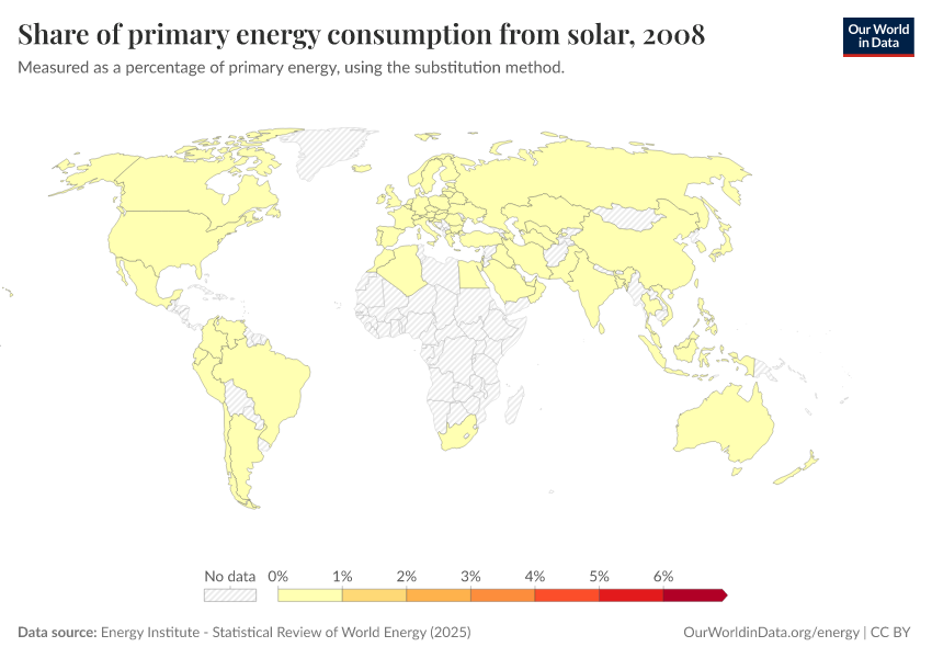Energy Institute - Statistical Review of World Energy (2025) – with major processing by Our World in Data. “Share of primary energy consumption that comes from solar power – Using the substitution method” [dataset]. Energy Institute, “Statistical Review of World Energy” [original data]. Retrieved March 19, 2026 from https://archive.ourworldindata.org/20260304-094028/grapher/solar-share-energy.html (archived on March 4, 2026).