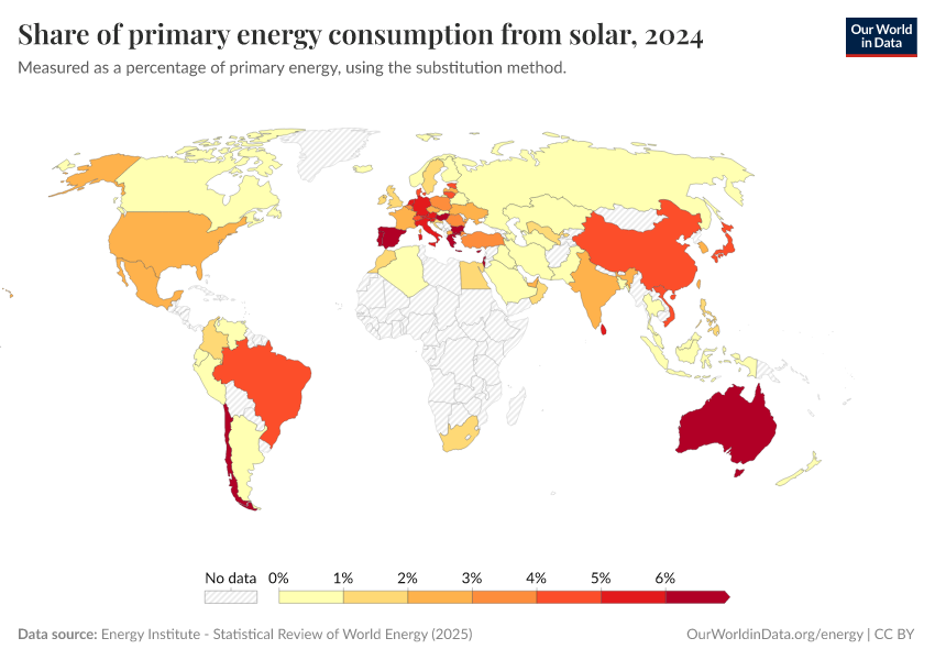 “Data Page: Share of primary energy consumption that comes from solar power”, part of the following publication: Hannah Ritchie, Pablo Rosado, and Max Roser (2023) - “Energy”. Data adapted from Energy Institute. Retrieved from https://archive.ourworldindata.org/20250909-093708/grapher/solar-share-energy.html [online resource] (archived on September 9, 2025).How to cite this data