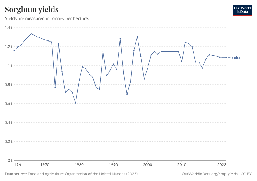 “Data Page: Sorghum yields”, part of the following publication: Hannah Ritchie, Pablo Rosado, and Max Roser (2023) - “Agricultural Production”. Data adapted from Food and Agriculture Organization of the United Nations. Retrieved from https://archive.ourworldindata.org/20251014-161652/grapher/sorghum-yield.html [online resource] (archived on October 14, 2025).