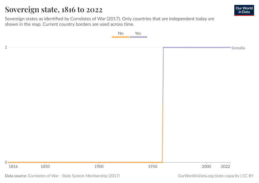“Data Page: Sovereign state”, part of the following publication: Bastian Herre and Pablo Arriagada (2023) - “State Capacity”. Data adapted from Correlates of War. Retrieved from https://archive.ourworldindata.org/20251208-134119/grapher/sovereign-state-cow.html [online resource] (archived on December 8, 2025).How to cite this data