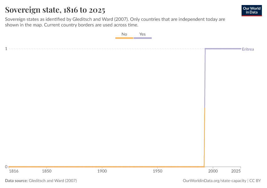 “Data Page: Sovereign state”, part of the following publication: Bastian Herre and Pablo Arriagada (2023) - “State Capacity”. Data adapted from Gleditsch and Ward. Retrieved from https://archive.ourworldindata.org/20260119-070102/grapher/sovereign-state-gleditsch-ward.html [online resource] (archived on January 19, 2026).How to cite this data