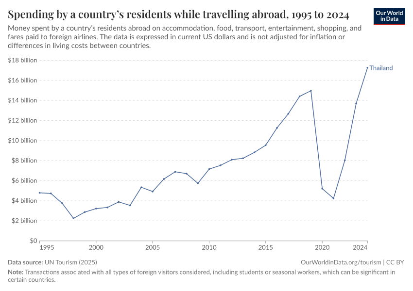 UN Tourism (2025) – processed by Our World in Data. “Spending by a country’s residents while travelling abroad” [dataset]. UN Tourism, “UN Tourism Statistics Database” [original data]. Retrieved February 16, 2026 from https://archive.ourworldindata.org/20260205-150129/grapher/spending-by-a-countrys-residents-while-travelling-abroad.html (archived on February 5, 2026).