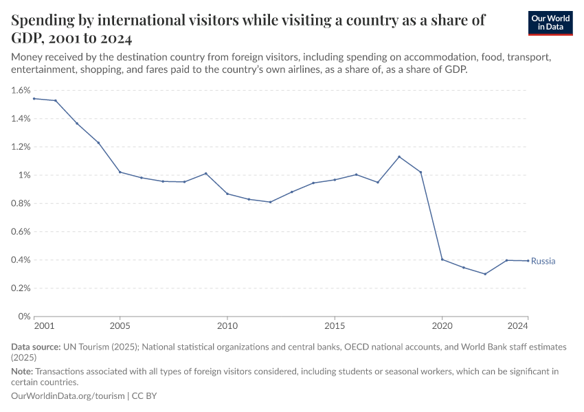 UN Tourism (2025); National statistical organizations and central banks, OECD national accounts, and World Bank staff estimates (2025) – processed by Our World in Data. “Spending by international visitors while visiting a country as a share of GDP” [dataset]. UN Tourism, “UN Tourism Statistics Database”; National statistical organizations and central banks, OECD national accounts, and World Bank staff estimates, “World Development Indicators 122” [original data]. Retrieved February 21, 2026 from https://archive.ourworldindata.org/20260205-150838/grapher/spending-by-international-visitors-while-visiting-a-country-as-a-share-of-gdp.html (archived on February 5, 2026).
