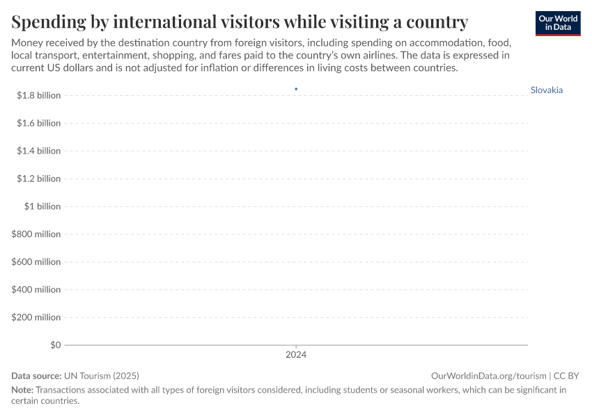 UN Tourism (2025) – processed by Our World in Data. “Spending by international visitors while visiting a country” [dataset]. UN Tourism, “UN Tourism Statistics Database” [original data]. Retrieved February 17, 2026 from https://archive.ourworldindata.org/20260205-150129/grapher/spending-by-international-visitors-while-visiting-a-country.html (archived on February 5, 2026).