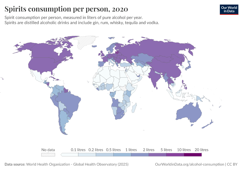 World Health Organization - Global Health Observatory (2025) – processed by Our World in Data. “Spirits consumption per person” [dataset]. World Health Organization, “Global Health Observatory” [original data]. Retrieved April 4, 2026 from https://archive.ourworldindata.org/20260304-094028/grapher/spirits-consumption-per-person.html (archived on March 4, 2026).Download