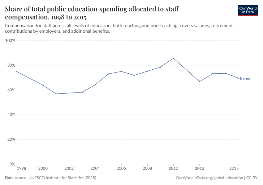 UNESCO Institute for Statistics (2025) – with minor processing by Our World in Data. “Share of total public education spending allocated to staff compensation” [dataset]. UNESCO Institute for Statistics, “UNESCO Institute for Statistics (UIS) - Education” [original data]. Retrieved January 1, 2026 from https://archive.ourworldindata.org/20250909-093708/grapher/staff-compensation-as-share-of-total-expenditure-in-public-education-all-levels.html (archived on September 9, 2025).