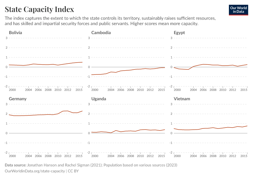 “Data Page: State Capacity Index”, part of the following publication: Bastian Herre and Pablo Arriagada (2023) - “State Capacity”. Data adapted from Jonathan Hanson and Rachel Sigman, Various sources. Retrieved from https://archive.ourworldindata.org/20251127-170114/grapher/state-capacity-index.html [online resource] (archived on November 27, 2025).How to cite this data