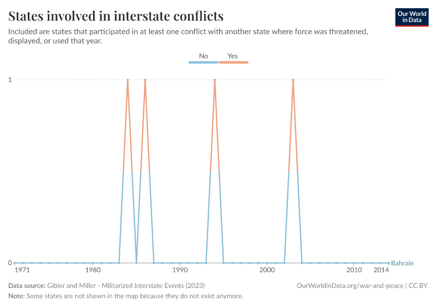 “Data Page: States involved in interstate conflicts”, part of the following publication: Bastian Herre, Lucas Rodés-Guirao, and Max Roser (2024) - “War and Peace”. Data adapted from Gibler and Miller. Retrieved from https://archive.ourworldindata.org/20250909-093708/grapher/states-involved-in-interstate-conflicts.html [online resource] (archived on September 9, 2025).