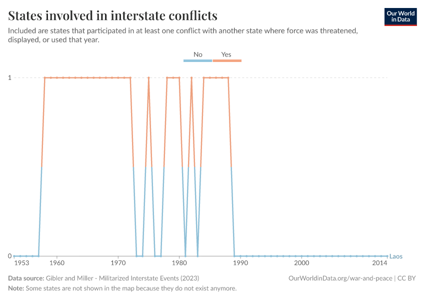 Gibler and Miller - Militarized Interstate Events (2023) – with major processing by Our World in Data. “States involved in interstate conflicts” [dataset]. Gibler and Miller, “Militarized Interstate Events” [original data]. Retrieved December 29, 2025 from https://archive.ourworldindata.org/20250909-093708/grapher/states-involved-in-interstate-conflicts.html (archived on September 9, 2025).