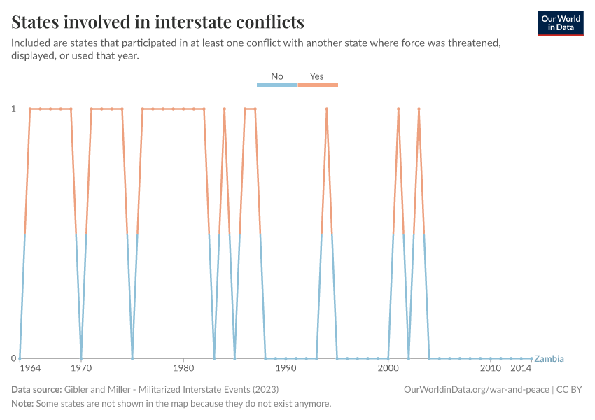 Gibler and Miller - Militarized Interstate Events (2023) – with major processing by Our World in Data. “States involved in interstate conflicts” [dataset]. Gibler and Miller, “Militarized Interstate Events” [original data]. Retrieved December 27, 2025 from https://archive.ourworldindata.org/20250909-093708/grapher/states-involved-in-interstate-conflicts.html (archived on September 9, 2025).