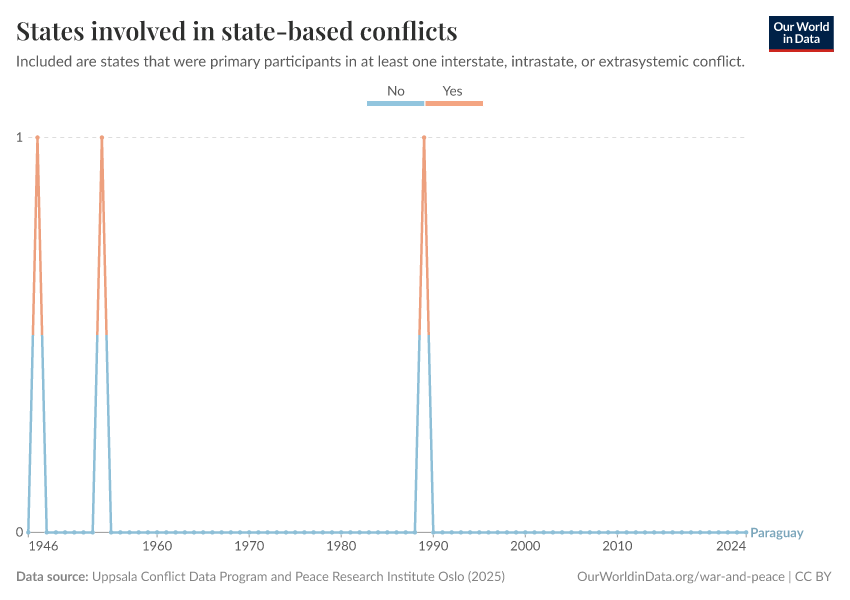 “Data Page: States involved in state-based conflicts”, part of the following publication: Bastian Herre, Lucas Rodés-Guirao, and Max Roser (2024) - “War and Peace”. Data adapted from Uppsala Conflict Data Program, Uppsala Conflict Data Program and Peace Research Institute Oslo. Retrieved from https://archive.ourworldindata.org/20250909-093708/grapher/states-involved-in-state-based-conflicts.html [online resource] (archived on September 9, 2025).