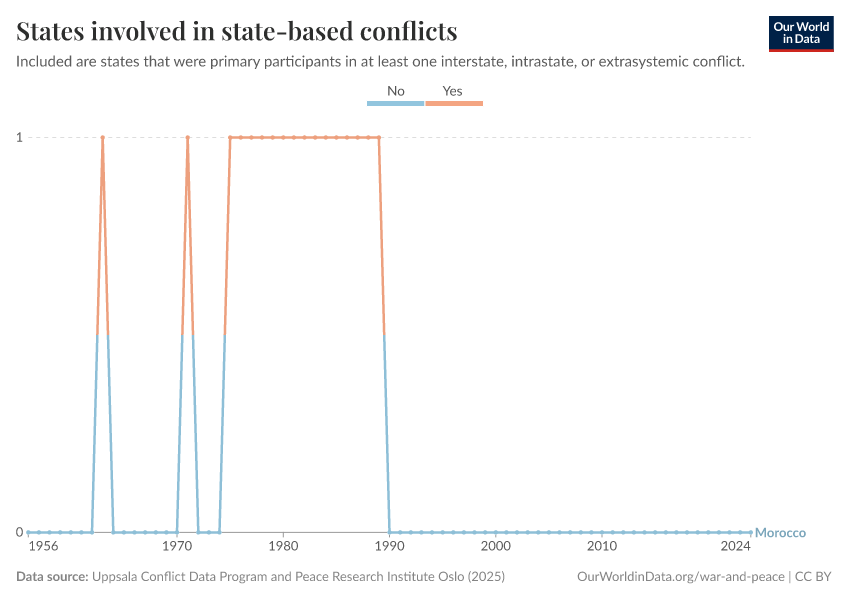 “Data Page: States involved in state-based conflicts”, part of the following publication: Bastian Herre, Lucas Rodés-Guirao, and Max Roser (2024) - “War and Peace”. Data adapted from Uppsala Conflict Data Program, Uppsala Conflict Data Program and Peace Research Institute Oslo. Retrieved from https://archive.ourworldindata.org/20250909-093708/grapher/states-involved-in-state-based-conflicts.html [online resource] (archived on September 9, 2025).How to cite this data