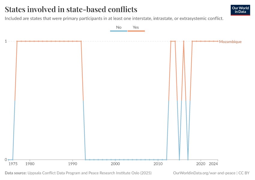 “Data Page: States involved in state-based conflicts”, part of the following publication: Bastian Herre, Lucas Rodés-Guirao, and Max Roser (2024) - “War and Peace”. Data adapted from Uppsala Conflict Data Program, Uppsala Conflict Data Program and Peace Research Institute Oslo. Retrieved from https://archive.ourworldindata.org/20250909-093708/grapher/states-involved-in-state-based-conflicts.html [online resource] (archived on September 9, 2025).How to cite this data