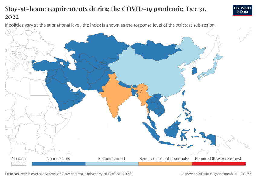 Blavatnik School of Government, University of Oxford (2023) – with minor processing by Our World in Data. “Stay-at-home requirements during the COVID-19 pandemic” [dataset]. Blavatnik School of Government, University of Oxford, “Government Response Tracker (OxCGRT)” [original data]. Retrieved January 16, 2026 from https://archive.ourworldindata.org/20250909-093708/grapher/stay-at-home-covid.html (archived on September 9, 2025).