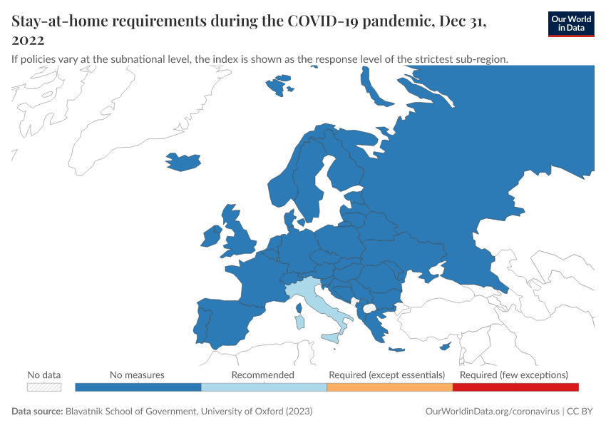 Blavatnik School of Government, University of Oxford (2023) – with minor processing by Our World in Data. “Stay-at-home requirements during the COVID-19 pandemic” [dataset]. Blavatnik School of Government, University of Oxford, “Government Response Tracker (OxCGRT)” [original data]. Retrieved January 15, 2026 from https://archive.ourworldindata.org/20250909-093708/grapher/stay-at-home-covid.html (archived on September 9, 2025).