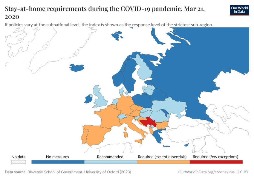 “Data Page: Stay-at-home requirements during the COVID-19 pandemic”, part of the following publication: Edouard Mathieu, Hannah Ritchie, Lucas Rodés-Guirao, Cameron Appel, Daniel Gavrilov, Charlie Giattino, Joe Hasell, Bobbie Macdonald, Saloni Dattani, Diana Beltekian, Esteban Ortiz-Ospina, and Max Roser (2020) - “COVID-19 Pandemic”. Data adapted from Blavatnik School of Government, University of Oxford. Retrieved from https://archive.ourworldindata.org/20250909-093708/grapher/stay-at-home-covid.html [online resource] (archived on September 9, 2025).How to cite this data
