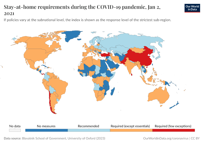 Blavatnik School of Government, University of Oxford (2023) – with minor processing by Our World in Data. “Stay-at-home requirements during the COVID-19 pandemic” [dataset]. Blavatnik School of Government, University of Oxford, “Government Response Tracker (OxCGRT)” [original data]. Retrieved December 18, 2025 from https://archive.ourworldindata.org/20250909-093708/grapher/stay-at-home-covid.html (archived on September 9, 2025).