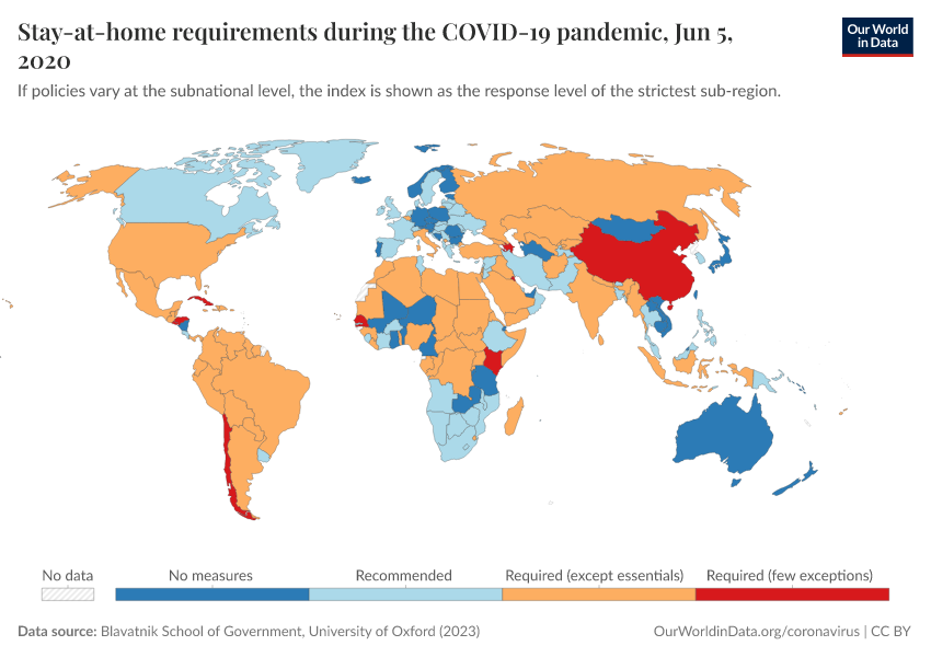 Blavatnik School of Government, University of Oxford (2023) – with minor processing by Our World in Data. “Stay-at-home requirements during the COVID-19 pandemic” [dataset]. Blavatnik School of Government, University of Oxford, “Government Response Tracker (OxCGRT)” [original data]. Retrieved January 18, 2026 from https://archive.ourworldindata.org/20250909-093708/grapher/stay-at-home-covid.html (archived on September 9, 2025).