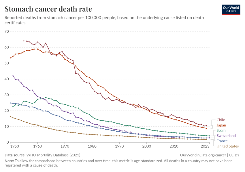 WHO Mortality Database (2025) – with minor processing by Our World in Data. “Stomach cancer death rate” [dataset]. WHO Mortality Database, “WHO Mortality Database” [original data]. Retrieved January 13, 2026 from https://archive.ourworldindata.org/20250909-093708/grapher/stomach-cancer-death-rate.html (archived on September 9, 2025).