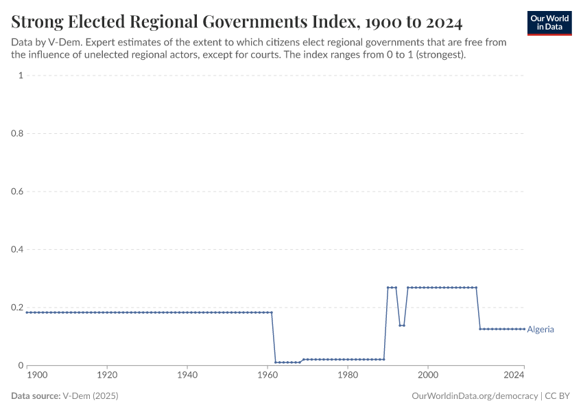 “Data Page: Elected regional governments”, part of the following publication: Bastian Herre, Lucas Rodés-Guirao, and Esteban Ortiz-Ospina (2013) - “Democracy”. Data adapted from V-Dem. Retrieved from https://archive.ourworldindata.org/20251209-133038/grapher/strong-elected-regional-governments-index.html [online resource] (archived on December 9, 2025).How to cite this data