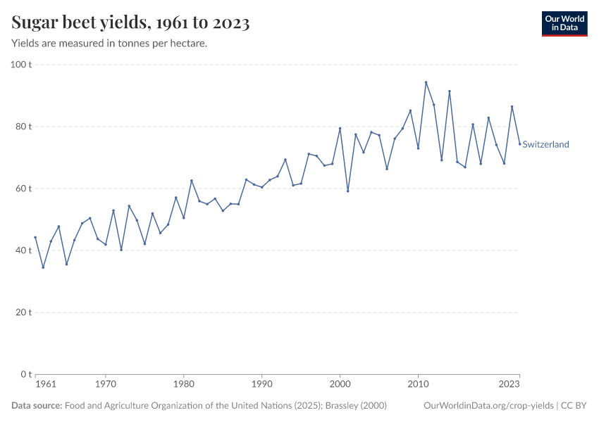 “Data Page: Sugar beet yields”, part of the following publication: Hannah Ritchie, Pablo Rosado, and Max Roser (2022) - “Crop Yields”. Data adapted from Food and Agriculture Organization of the United Nations, Brassley. Retrieved from https://archive.ourworldindata.org/20251014-161652/grapher/sugar-beet-yields.html [online resource] (archived on October 14, 2025).