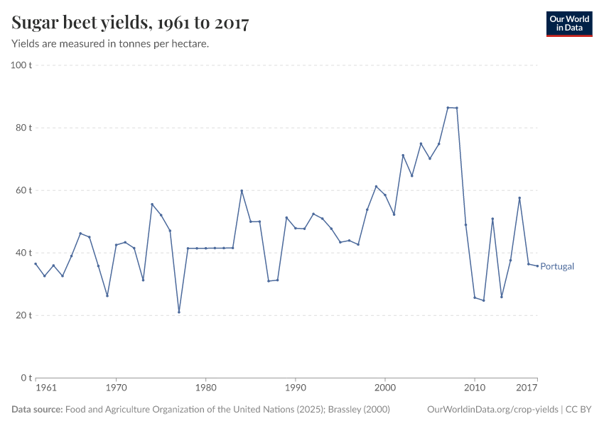 “Data Page: Sugar beet yields”, part of the following publication: Hannah Ritchie, Pablo Rosado, and Max Roser (2022) - “Crop Yields”. Data adapted from Food and Agriculture Organization of the United Nations, Brassley. Retrieved from https://archive.ourworldindata.org/20251014-161652/grapher/sugar-beet-yields.html [online resource] (archived on October 14, 2025).