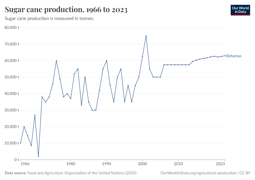Food and Agriculture Organization of the United Nations (2025) – with major processing by Our World in Data. “Sugar cane production – UN FAO” [dataset]. Food and Agriculture Organization of the United Nations, “Production: Crops and livestock products” [original data]. Retrieved December 8, 2025 from https://archive.ourworldindata.org/20251014-161652/grapher/sugar-cane-production.html (archived on October 14, 2025).