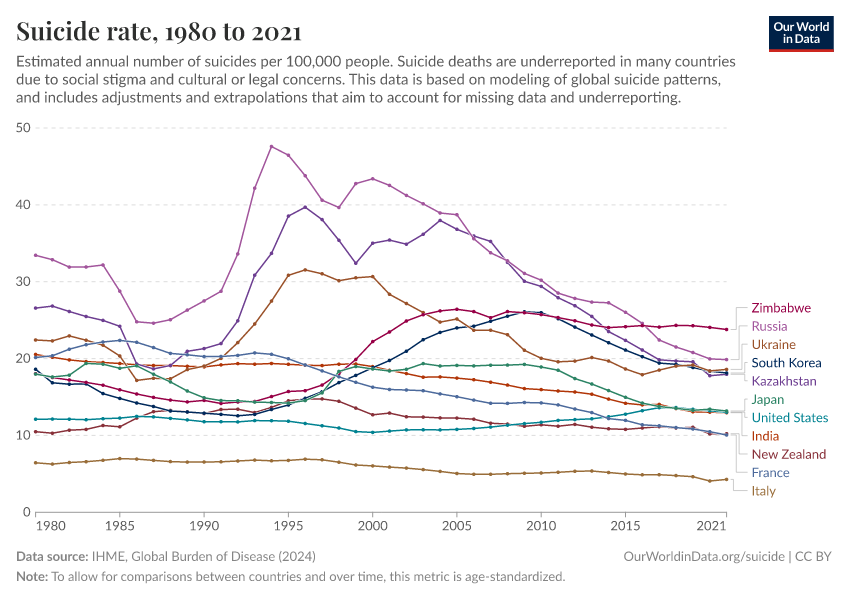 IHME, Global Burden of Disease (2024) – with minor processing by Our World in Data. “Suicide rate” [dataset]. IHME, Global Burden of Disease, “Global Burden of Disease - Deaths and DALYs” [original data]. Retrieved December 16, 2025 from https://archive.ourworldindata.org/20250909-093708/grapher/suicide-death-rates.html (archived on September 9, 2025).