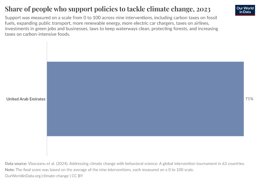 “Data Page: Share of people who support policies to tackle climate change”. Our World in Data (2025). Data adapted from Vlasceanu et al. (2024). Addressing climate change with behavioral science: A global intervention tournament in 63 countries.. Retrieved from https://archive.ourworldindata.org/20250909-093708/grapher/support-policies-climate.html [online resource] (archived on September 9, 2025).