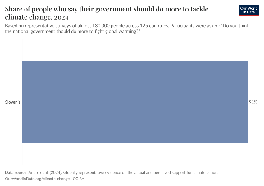 “Data Page: Share of people who say their government should do more to tackle climate change”. Our World in Data (2026). Data adapted from Andre et al. (2024). Globally representative evidence on the actual and perceived support for climate action.. Retrieved from https://archive.ourworldindata.org/20250909-093708/grapher/support-political-climate-action.html [online resource] (archived on September 9, 2025).How to cite this data