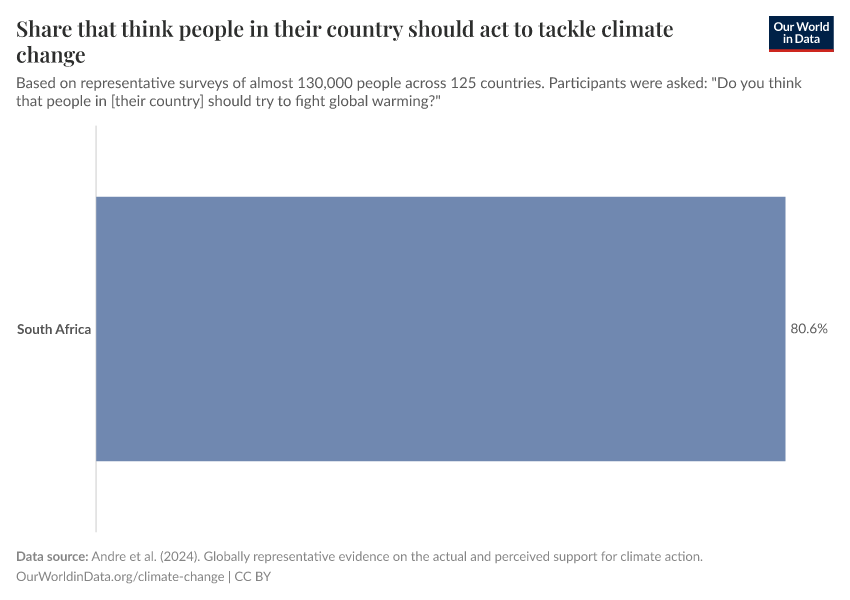 “Data Page: Share that think people in their country should act to tackle climate change”. Our World in Data (2025). Data adapted from Andre et al. (2024). Globally representative evidence on the actual and perceived support for climate action.. Retrieved from https://archive.ourworldindata.org/20250909-093708/grapher/support-public-action-climate.html [online resource] (archived on September 9, 2025).How to cite this data