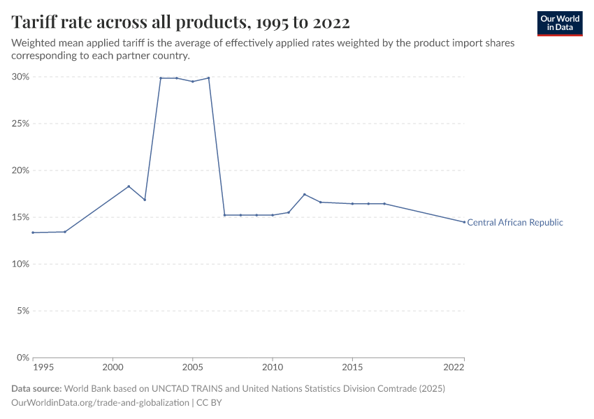“Data Page: Tariff rate across all products”. Our World in Data (2025). Data adapted from World Bank based on UNCTAD TRAINS and United Nations Statistics Division Comtrade. Retrieved from https://archive.ourworldindata.org/20250916-102301/grapher/tariff-rate-applied-weighted-mean-all-products.html [online resource] (archived on September 16, 2025).How to cite this data
