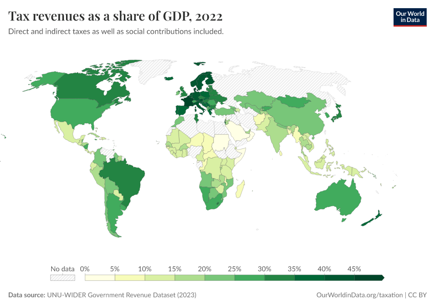 UNU-WIDER Government Revenue Dataset (2023) – with major processing by Our World in Data. “Tax revenues as a share of GDP – UNU-WIDER” [dataset]. UNU-WIDER, “Government Revenue Dataset (GRD) 2023” [original data]. Retrieved January 16, 2026 from https://archive.ourworldindata.org/20260105-133053/grapher/tax-revenues-as-a-share-of-gdp-unu-wider.html (archived on January 5, 2026).