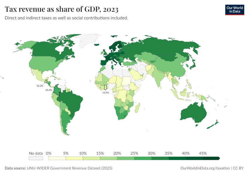 “Data Page: Tax revenue as share of GDP”, part of the following publication: Esteban Ortiz-Ospina and Max Roser (2016) - “Taxation”. Data adapted from UNU-WIDER. Retrieved from https://archive.ourworldindata.org/20260325-171315/grapher/tax-revenues-as-a-share-of-gdp-unu-wider.html [online resource] (archived on March 25, 2026).