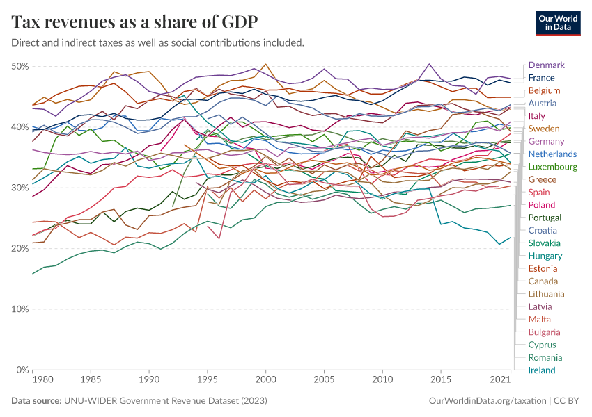 UNU-WIDER Government Revenue Dataset (2023) – with major processing by Our World in Data. “Tax revenues as a share of GDP – UNU-WIDER” [dataset]. UNU-WIDER, “Government Revenue Dataset (GRD) 2023” [original data]. Retrieved December 10, 2025 from https://archive.ourworldindata.org/20251209-133038/grapher/tax-revenues-as-a-share-of-gdp-unu-wider.html (archived on December 9, 2025).