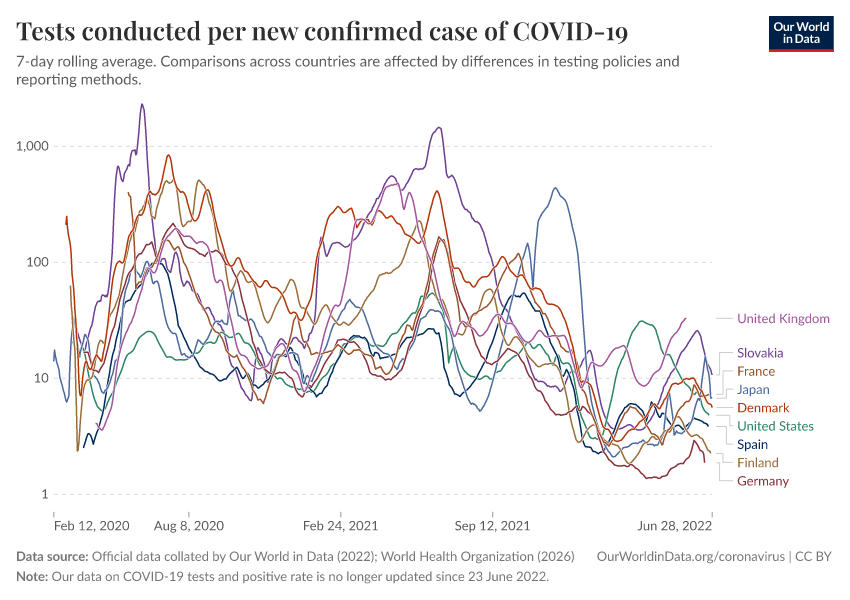 “Data Page: Tests conducted per new confirmed case of COVID-19”. Our World in Data (2026). Data adapted from Official data collated by Our World in Data, World Health Organization. Retrieved from https://archive.ourworldindata.org/20260115-063318/grapher/tests-per-confirmed-case-daily-smoothed.html [online resource] (archived on January 15, 2026).