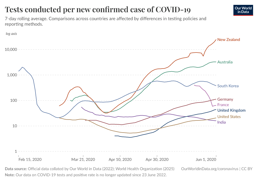 Official data collated by Our World in Data (2022); World Health Organization (2025) – with major processing by Our World in Data. “Tests conducted per new confirmed case of COVID-19” [dataset]. Official data collated by Our World in Data, “COVID-19, testing”; World Health Organization, “COVID-19 Dashboard WHO COVID-19 Dashboard - Daily cases and deaths” [original data]. Retrieved December 18, 2025 from https://archive.ourworldindata.org/20251218-063317/grapher/tests-per-confirmed-case-daily-smoothed.html (archived on December 18, 2025).